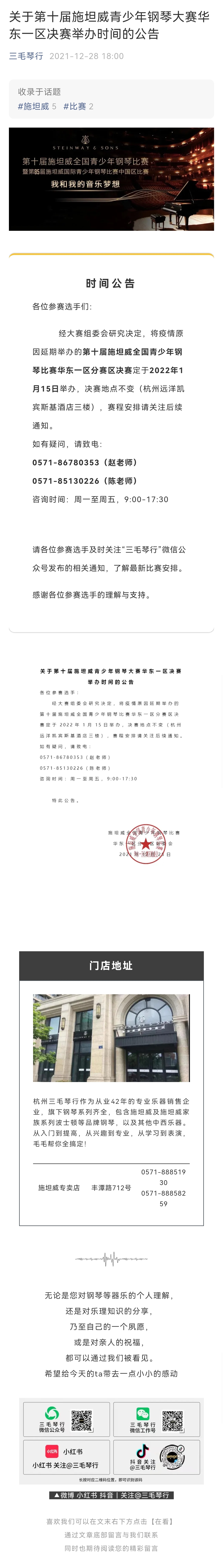 關(guān)于第十屆施坦威青少年鋼琴大賽華東一區(qū)決賽舉辦時間的公告
